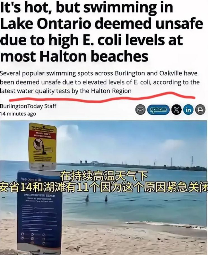 结果水质检测报告一出来,加拿大人直接梦碎当场,14个沙滩和湖泊都大肠杆菌超标。