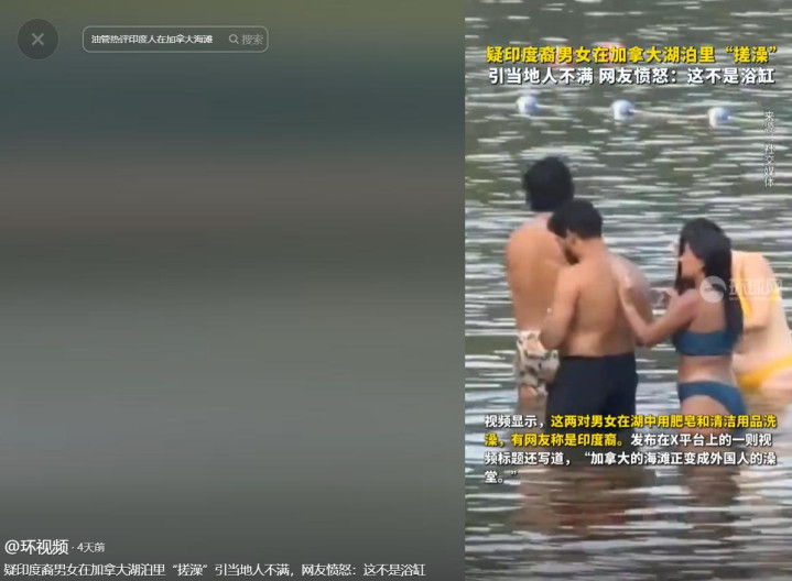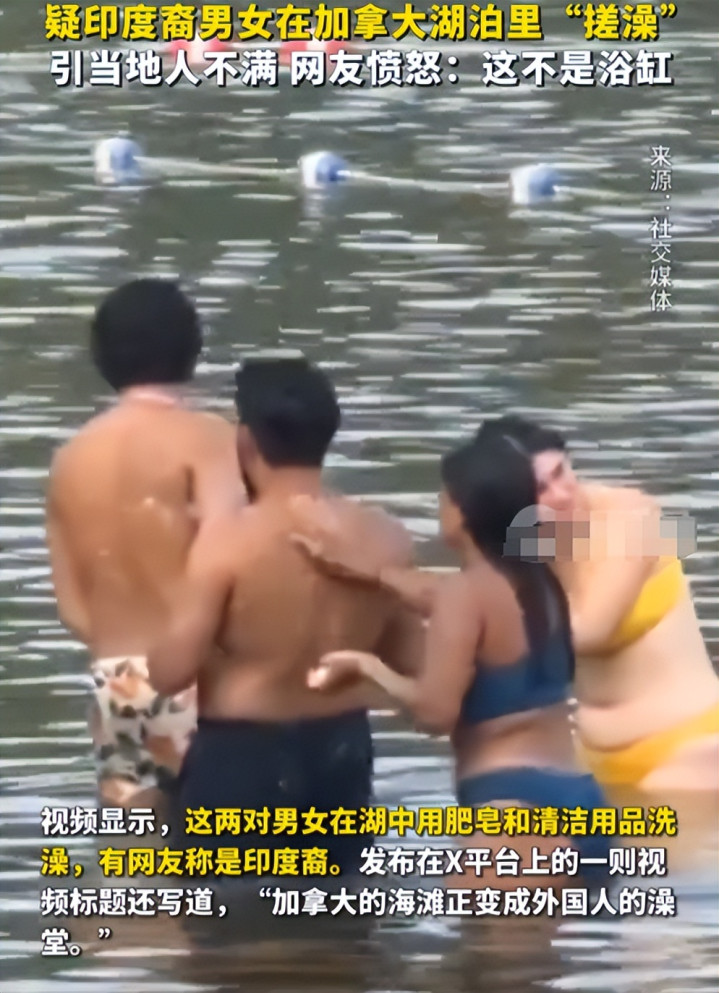 有网友上传了在安大略一处湖泊拍下的画面,两男两女穿着泳衣在湖泊拿着肥皂互相搓背。