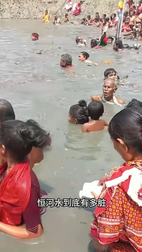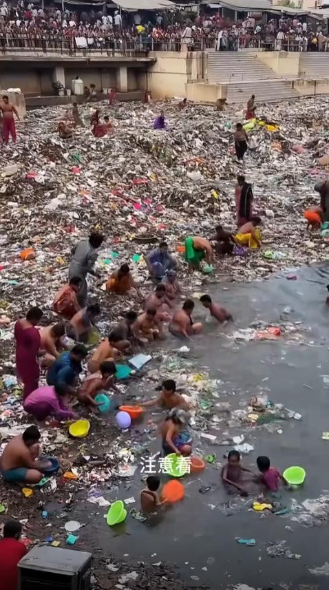 即便一眼望上去是水又黑又黄,垃圾多似垃圾回收站,印度人民依旧扎堆在里面狂欢。